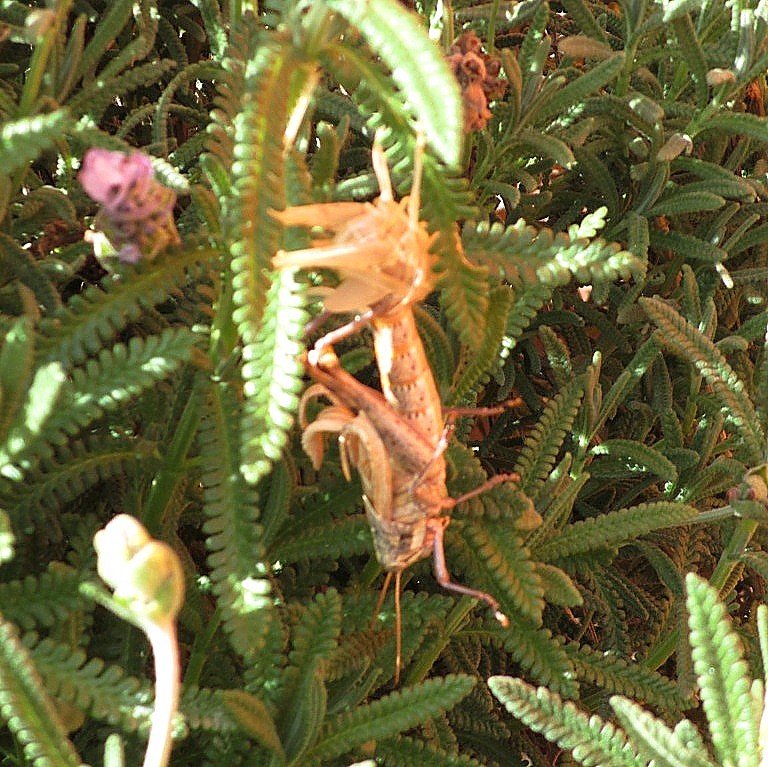 These are recently taken photos of one of our backyard lavender plants. It was only by luck that we noticed the strange phenomena known as molting, whereby some insects shed their exoskeletons. Grasshopper nymphs do this 5 to 6 times before reaching adulthood, after which they die in about 2 months. This fellow will probably enjoy one of my purposely-unprotected Asian bok choy plants, which I leave for the butterflies (and their larva) to enjoy. Since this writing, a second grasshopper has been discovered already emerged from her exoskeleton.